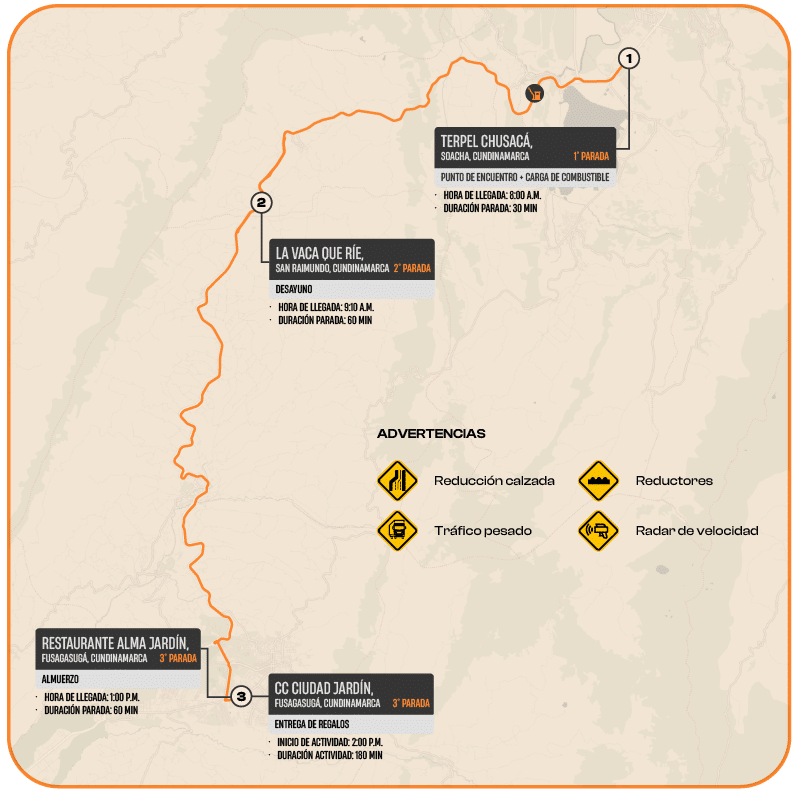 Viajaremos en caravana desde Bogotá hasta Fusagasugá, con paradas técnicas y puntos de entrega de regalos.